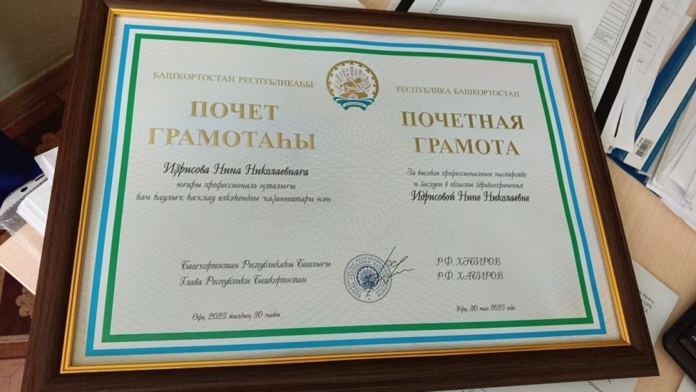 Нине Николаевне вручена почетная грамота Главы РБ Хабирова Р.Ф. за высокое профессиональное мастерство и многолетний, плодотворный труд в системе здравоохранения. Ее общий стаж работы в сфере здравоохранения составляет целых 32 года